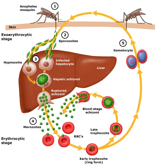Following the bite of an infected female Anopheles mosquito, the inoculated sporozoites migrate to the liver within one to two hours. Individuals are generally asymptomatic for 12 to 35 days after infection, but symptoms can commence as early as 7 days (depending on parasite species). Symptoms begin during the erythrocytic stage of the parasite life cycle, when infected red cells rupture and release merozoites, leading to fever and other symptoms.